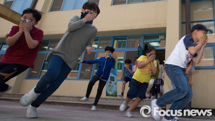 (공주=포커스뉴스) 18일 오후 충남 공주 신월초등학교에서 2016 재난대응 안전한국훈련 일환으로 실시된 현장대응 훈련에서 가스폭발로 인한 화재 발생을 가정, 학생들이 대피훈련을 하고 있다.