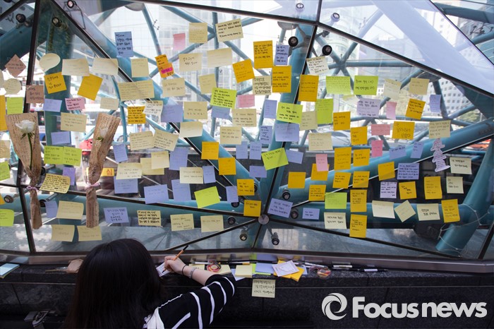 (서울=포커스뉴스) 18일 서울 서초구 강남역 10번출구에서 시민들이 '묻지마 살인' 피해자를 추모하고 있다.