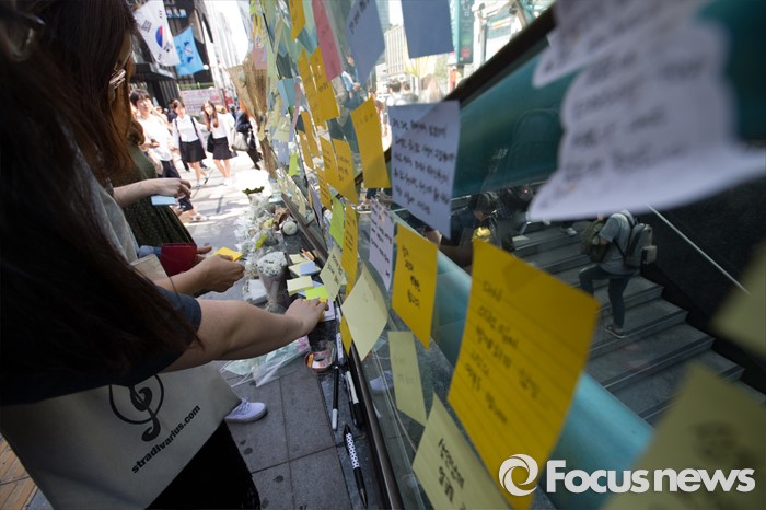 (서울=포커스뉴스) 18일 서울 서초구 강남역 10번출구에서 시민들이 '묻지마 살인' 피해자를 추모하고 있다.