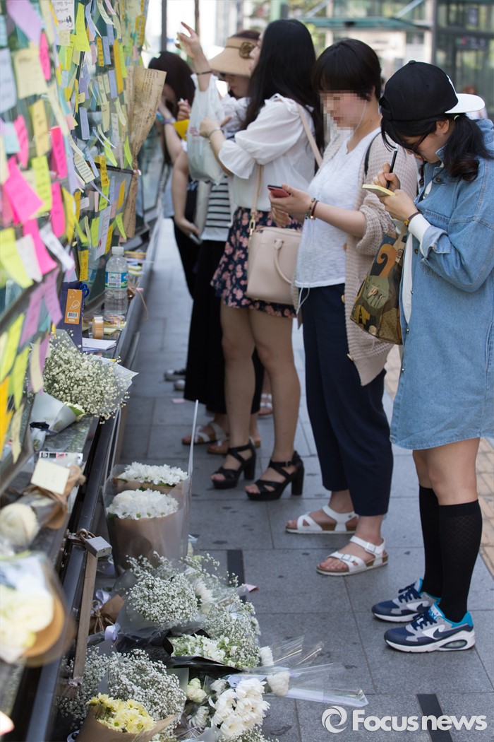 (서울=포커스뉴스) 18일 서울 서초구 강남역 10번출구에서 시민들이 '묻지마 살인' 피해자를 추모하고 있다.