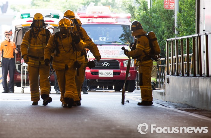 (서울=포커스뉴스) 18일 오후 서울 용산구 남산2호터널에서 재난대응 안전한국훈련-터널내 화재사고 대비 훈련이 진행되고 있다.
