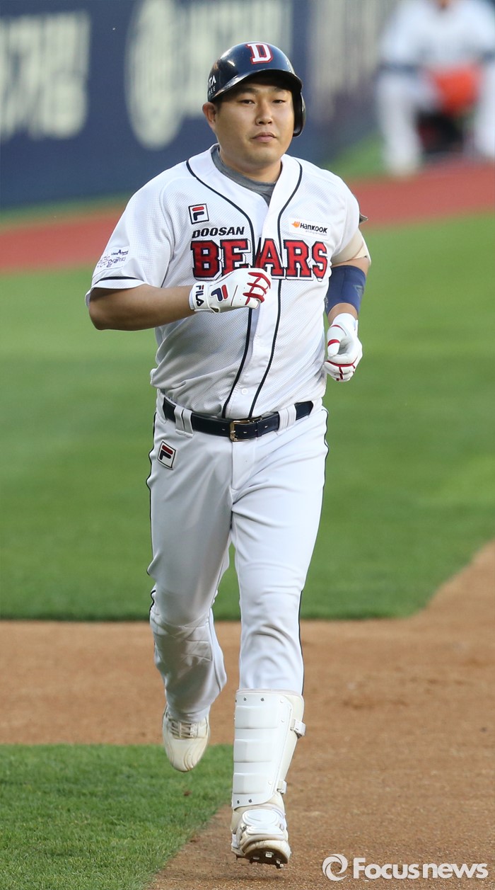 (서울=포커스뉴스) 18일 서울 잠실구장에서 열린 2016프로야구 KIA-두산 경기에서 2회말 두산 선두타자 양의지가 좌월 1점 홈런을 치고 3루를 돌아 홈인하고 있다.