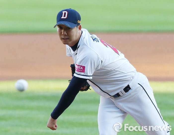 (서울=포커스뉴스) 18일 서울 잠실구장에서 열린 2016프로야구 KIA-두산 경기에서 1회초 두산 선발투수 장원준이 투구하고 있다.