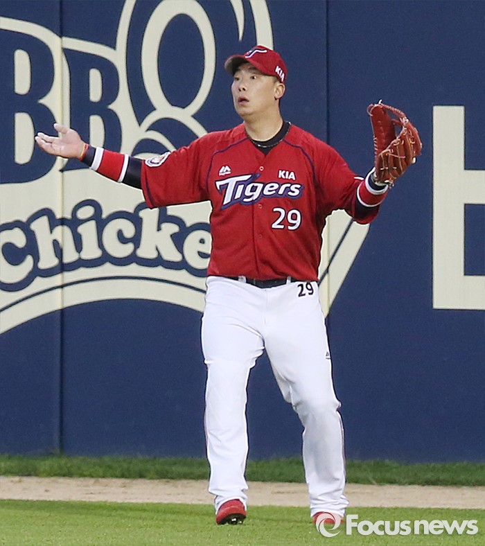(서울=포커스뉴스) 18일 서울 잠실구장에서 열린 2016프로야구 KIA-두산 경기 3회말 2사 1,3루에서 KIA 우익수 나지완이 두산 오재일의 뜬공 타구를 쫓다 놓치자 난감한 표정을 하고 있다.