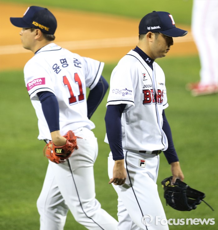 (서울=포커스뉴스) 18일 서울 잠실구장에서 열린 2016프로야구 KIA-두산 경기 6회초 2사 2루에서 KIA 김주형에게 볼넷을 내준 두산 선발 장원준이 교체돼 마운드를 내려가고 있다. 윤명준이 구원등판하고 있다.