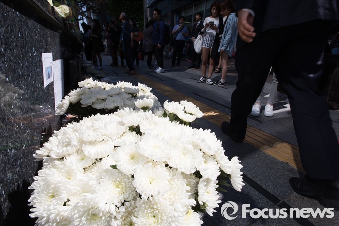 강남역 10번 출구에는 피해자를 추모하는 국화꽃과 안개꽃, 하얀 장미꽃다발 등이 놓였고 벽면에는 시민들이 남긴 추모 메시지가 가득했다.