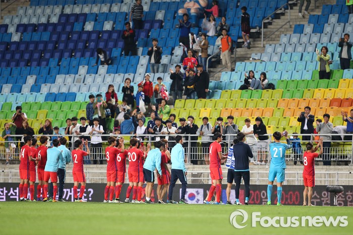 (수원=포커스뉴스) 18일 오후 경기도 수원시 수원월드컵경기장에서 열린 2016 수원 JS컵 U-19 국제청소년축구대회 대한민국과 브라질의 경기에서 한국 선수들이 경기종료 후 관중들에게 인사하고 있다.