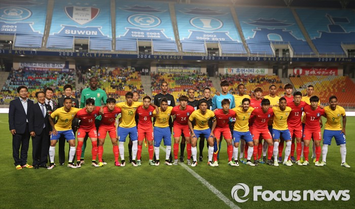 (수원=포커스뉴스) 18일 오후 경기도 수원시 수원월드컵경기장에서 열린 2016 수원 JS컵 U-19 국제청소년축구대회 대한민국과 브라질의 경기에 앞서 기념촬영을 하고 있다.