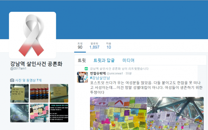현재'강남역 살인사건 공론화' 계정에는 1800여명의 누리꾼들이 팔로워하고 있다.18일 오전 생성된 '강남역 살인사건 공론화' 트위터 계정. <사진출처=트위터>