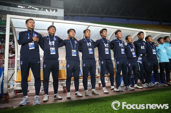 를수원=포커스뉴스) 18일 오후 경기도 수원시 수원월드컵경기장에서 열린 2016 수원 JS컵 U-19 국제청소년축구대회 대한민국과 브라질의 경기에서 안익수 감독과 코치진들이 애국가를 부르고 있다.