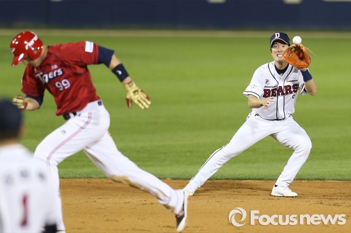 (서울=포커스뉴스) 18일 서울 잠실구장에서 열린 2016프로야구 KIA-두산 경기 7회초 2사 2루에서 두산 유격수 김재호가 KIA 나지완의 땅볼 타구를 잡고 있다. KIA 2루주자는 필.