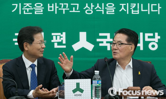 (서울=포커스뉴스) 19일 오전 서울 여의도 국회에서 열린 국민의당 의원총회에 참석한 천정배(왼쪽) 공동대표와 박지원 원내대표가 대화하고 있다.