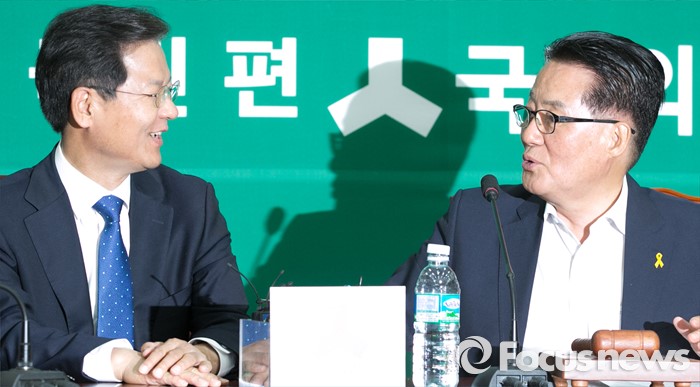 (서울=포커스뉴스) 19일 오전 서울 여의도 국회에서 열린 국민의당 의원총회에 참석한 천정배(왼쪽) 공동대표와 박지원 원내대표가 대화하고 있다.