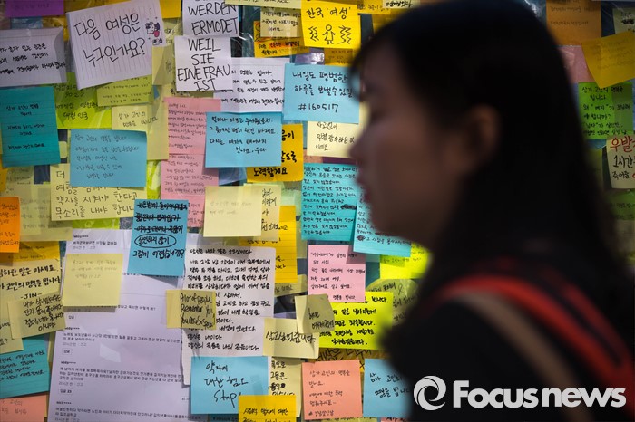 (서울=포커스뉴스) 19일 오전 서울 서초구 강남역 10번 출구에서 출근길 시민들이 '묻지마 살인' 피해자를 추모하고 있다.