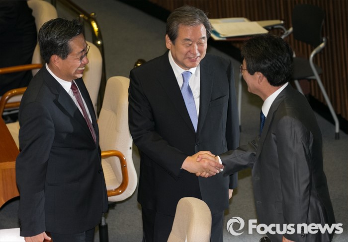 (서울=포커스뉴스) 19일 오전 서울 여의도 국회에서 열린 342회 국회(임시회) 1차 본회의에 참석한 김무성(가운데) 새누리당 전 대표와 유승민(오른쪽) 무소속 의원이 인사하고 있다.