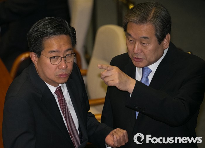 (서울=포커스뉴스) 19일 오전 서울 여의도 국회에서 열린 342회 국회(임시회) 1차 본회의에 참석한 김무성(오른쪽) 새누리당 전 대표와 전하진 의원이 대화하고 있다.