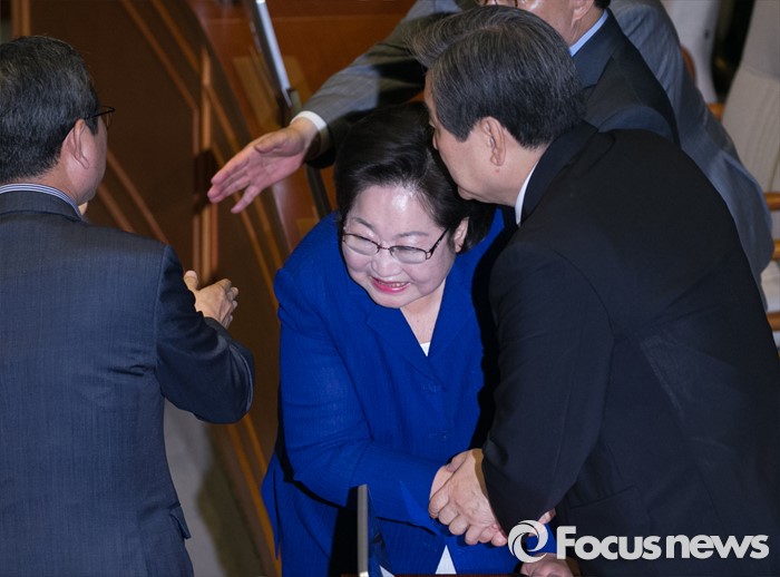 (서울=포커스뉴스) 19일 오전 서울 여의도 국회에서 열린 342회 국회(임시회) 1차 본회의에 참석한 김무성(오른쪽) 새누리당 전 대표와 김을동(가운데) 전 최고위원이 인사하고 있다.