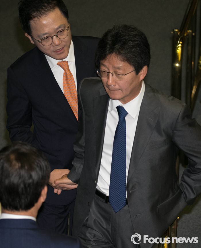 (서울=포커스뉴스) 19일 오전 서울 여의도 국회에서 열린 342회 국회(임시회) 1차 본회의에 참석한 청와대 경제수석으로 임명된 강석훈(왼쪽) 새누리당 의원과 유승민 무소속 의원이 인사하고 있다.