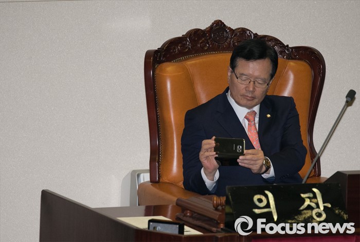 (서울=포커스뉴스) 19일 오전 서울 여의도 국회에서 열린 342회 국회(임시회) 1차 본회의에 참석한 정의화 국회의장이 핸드폰으로 사진촬영을 하고 있다.
