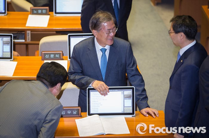 (서울=포커스뉴스) 19일 오전 서울 여의도 국회에서 열린 342회 국회(임시회) 1차 본회의에 참석한 문재인 더불어민주당 전 대표가 의원들과 대화하고 있다.