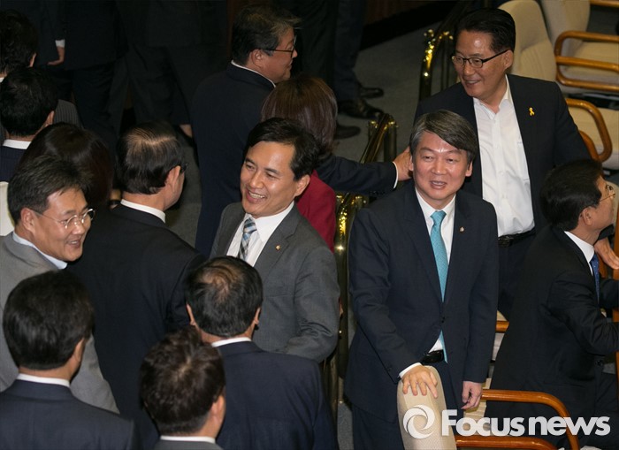 (서울=포커스뉴스) 19일 오전 서울 여의도 국회에서 열린 342회 국회(임시회) 1차 본회의에 참석한 안철수 국민의당 상임공동대표와 박지원 원내대표가 투표를 위해 줄을 서서 기다리는 새누리당 의원들과 인사하고 있다.