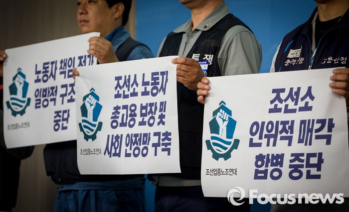 (서울=포커스뉴스) 19일 오전 여의도 국회 정론관에서 열린 '조선산업 발전과 구조조정에 관한 조선업종노조연대 대표자' 기자회견에 참석한 대표자들이 구조조정, 매각, 합병 중단을 요구하는 손팻말을 들고있다.