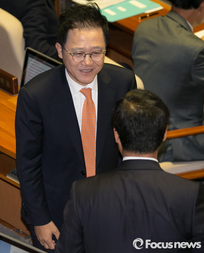 (서울=포커스뉴스) 19일 오전 서울 여의도 국회에서 열린 342회 국회(임시회) 1차 본회의에 참석한 청와대 경제수석으로 임명된 강석훈 의원이 동료 의원들과 대화하고 있다.