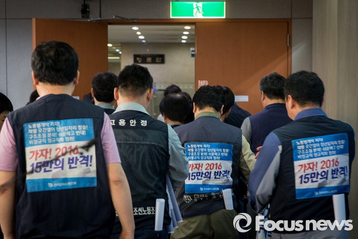 (서울=포커스뉴스) 19일 오전 여의도 국회 정론관에서 열린 '조선산업 발전과 구조조정에 관한 조선업종노조연대 대표자' 기자회견에 참석한 대표자들이 회견을 마친 후 발걸음을 옮기고 있다.