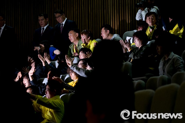 (서울=포커스뉴스) 19일 오전 서울 여의도 국회에서 열린 342회 국회(임시회) 1차 본회의에 4·16 세월호참사 특별조사위원회 황전원 위원 선출안 투표 결과를 지켜보기 위해 방청 온 세월호 참사 유가족들이 손을 흔들어 인사하고 있다.