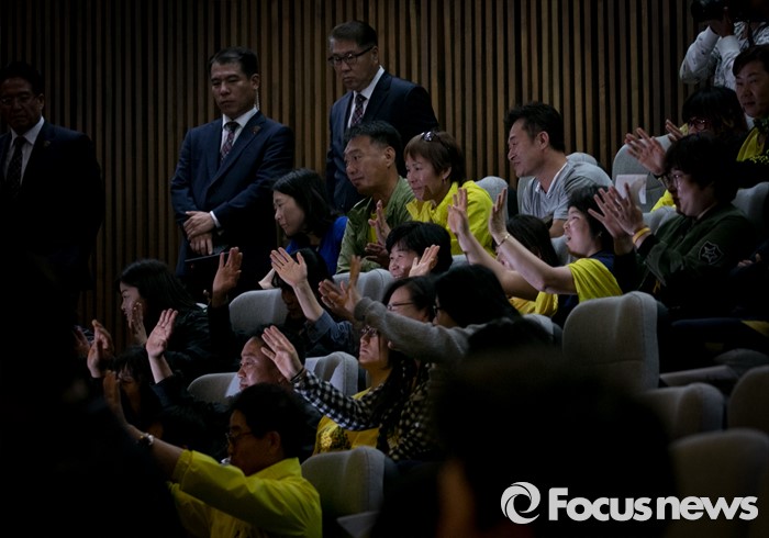 (서울=포커스뉴스) 19일 오전 서울 여의도 국회에서 열린 342회 국회(임시회) 1차 본회의에 4·16 세월호참사 특별조사위원회 황전원 위원 선출안 투표 결과를 지켜보기 위해 방청 온 세월호 참사 유가족들이 손을 흔들어 인사하고 있다.