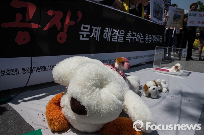 (서울=포커스뉴스) 19일 오후 서울 종로구 정부서울청사앞에서 동물자유연대 및 시민단체들이 강아지 공장 문제 해결을 촉구하며 퍼포먼스를 하고 있다.