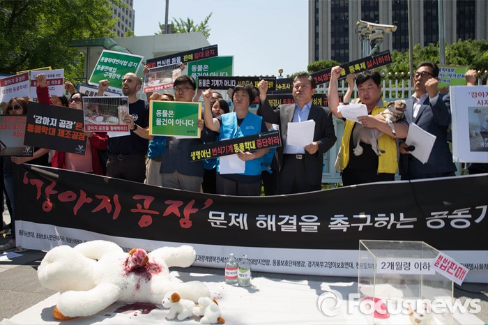(서울=포커스뉴스) 19일 오후 서울 종로구 정부서울청사앞에서 동물자유연대 및 시민단체들이 강아지 공장 문제 해결을 촉구하며 구호를 외치고 있다.
