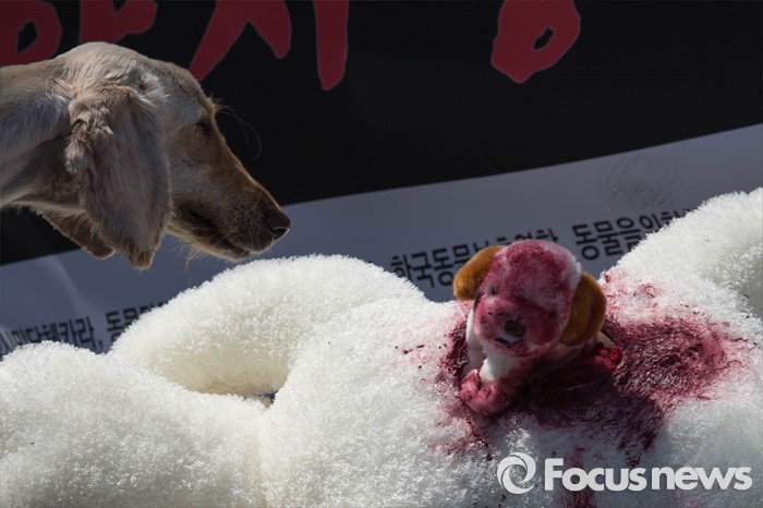 (서울=포커스뉴스) 19일 오후 서울 종로구 정부서울청사앞에서 동물자유연대 및 시민단체들이 강아지 공장 문제 해결을 촉구하며 퍼포먼스를 하고 있다.
