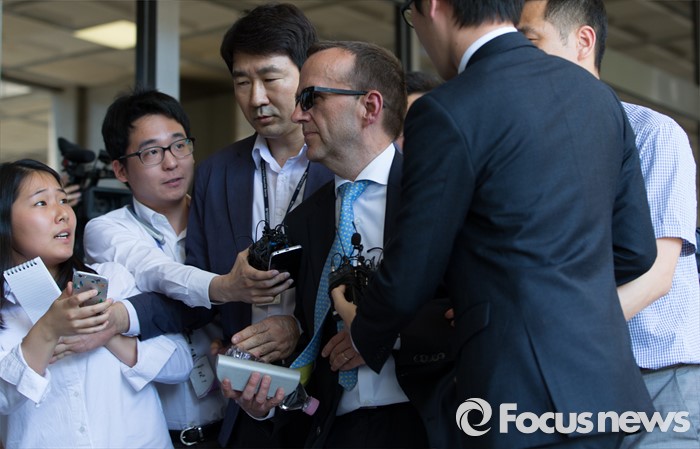 이날 호스터바흐 이사는 검찰의 출석 요구 시간에 맞춰 서울 서초동 서울중앙지검 청사 앞에 모습을 드러냈다.