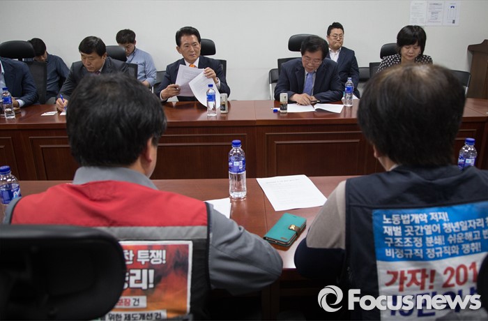 (서울=포커스뉴스) 19일 오후 서울 여의도 국회 의원회관에서 조선업종노조연대 대표자들과 각 정당 의원들이 간담회를 갖고 있다.