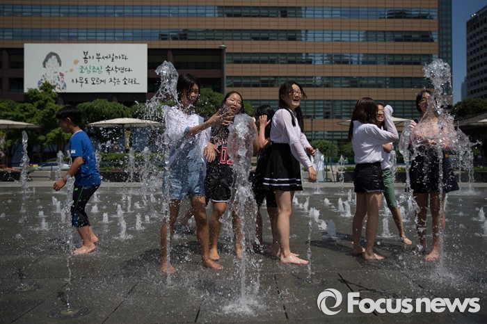 (서울=포커스뉴스) 서울의 낮 기온이 30도를 넘는 19일 오후 서울 광화문광장 분수대에서 아이들이 물놀이를 즐기고 있다.