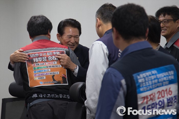 (서울=포커스뉴스) 김한표 새누리당 의원이 19일 오후 서울 여의도 국회 의원회관에서 열린 '조선업종노조연대 대표자들과 각 정당 의원 간담회'에 참석해 조선업종노조연대 대표자들과 인사하고 있다.