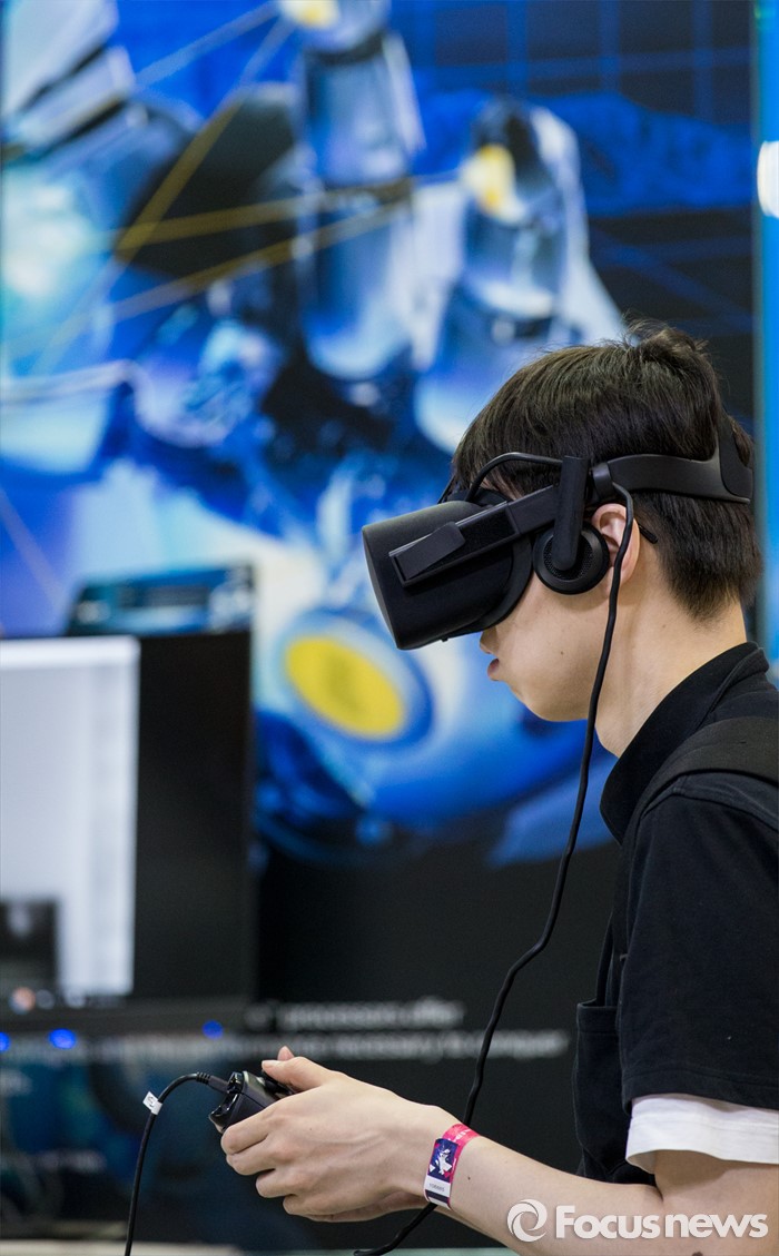 (고양=포커스뉴스) 19일 오후 경기 고양시 킨텍스 제1전시관에서 열린 2016 플레이엑스포를 찾은 관람객이 가상현실 게임을 즐기고 있다.
