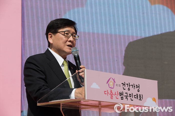 (서울=포커스뉴스) 19일 오후 서울시청광장에서 열린 '제1회 건강가정 다출산 범국민대회'에 참석한 정진엽 보건복지부 장관이 축사를 하고 있다.