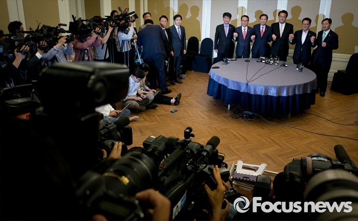 (서울=포커스뉴스) 19일 오후 서울 여의도 국회 귀빈식당에서 20대 국회 원구성 등 협상을 위해 열린 3당 원내대표 회동에 참석한 의원들이 취재진을 향해 포즈를 취하고 있다. 왼쪽부터 박완주 더불어민주당 원내수석부대표, 김도읍 새누리당 원내수석부대표, 우상호 더불어민주당 원내대표, 정진석 새누리당 원내대표, 박지원 국민의당 원내대표, 김관영 원내수석부대표.