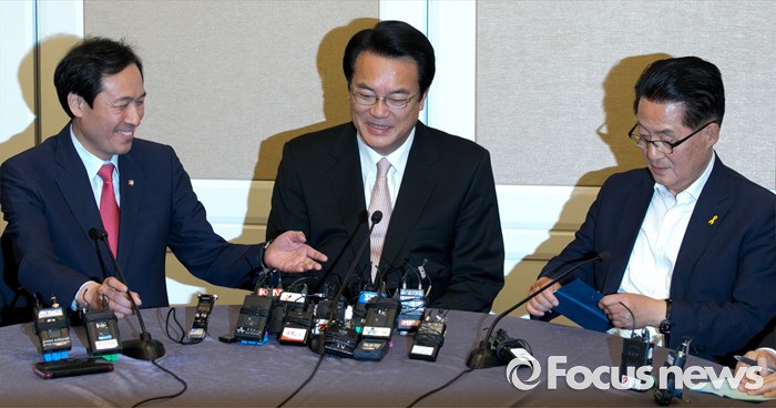 (서울=포커스뉴스) 19일 오후 서울 여의도 국회 귀빈식당에서 20대 국회 원구성 등 협상을 위해 열린 3당 원내대표 회동에 참석한 정진석(가운데) 새누리당 원내대표, 우상호(왼쪽) 더불어민주당 원내대표, 박지원 국민의당 원내대표가 대화하고 있다.