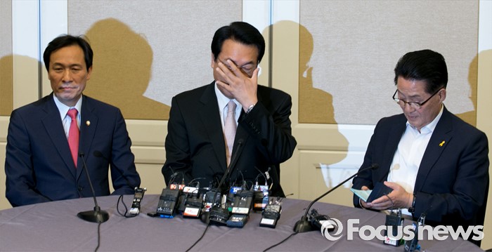 (서울=포커스뉴스) 19일 오후 서울 여의도 국회 귀빈식당에서 20대 국회 원구성 등 협상을 위해 열린 3당 원내대표 회동에 참석한 정진석(가운데) 새누리당 원내대표, 우상호(왼쪽) 더불어민주당 원내대표, 박지원 국민의당 원내대표가 생각에 잠겨 있다.