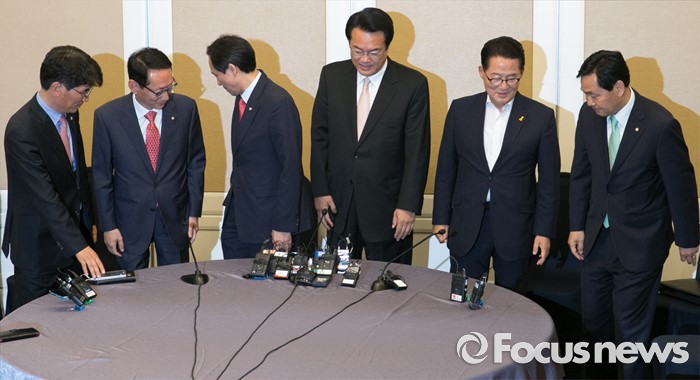(서울=포커스뉴스) 19일 오후 서울 여의도 국회 귀빈식당에서 20대 국회 원구성 등 협상을 위해 열린 3당 원내대표 회동에 참석한 의원들이 취재진을 향해 포즈를 취한 뒤 자리에 앉고 있다. 왼쪽부터 박완주 더불어민주당 원내수석부대표, 김도읍 새누리당 원내수석부대표, 우상호 더불어민주당 원내대표, 정진석 새누리당 원내대표, 박지원 국민의당 원내대표, 김관영 원내수석부대표.