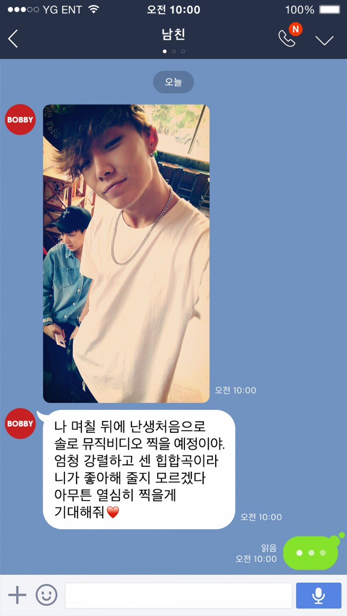 소속사 YG엔터테인먼트는 19일 공식블로그를 통해 바비의 사진과 메시지를 공개했다. 모바일 대화창을 빗댄 이미지 속 바비는 '남친(남자친구의 줄임말)'이라는 대화명으로 등장한다. 그는 "며칠 뒤에 난생처음으로 솔로 뮤직비디오를 찍을 예정이야"라고 메시지를 보냈다. 솔로곡 발표 사실을 알리며 "엄청 강렬하고 센 힙합곡"이라고 설명을 더했다.