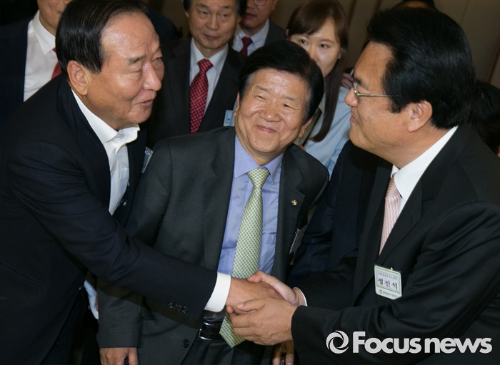 (서울=포커스뉴스) 19일 오후 여의도 서울시티클럽에서 열린 충청 향우 친선의 밤 행사에 참석한 정진석(오른쪽) 새누리당 원내대표와 서청원(왼쪽) 전 최고위원이 인사하고 있다. 가운데는 박병석 더불어민주당 의원.