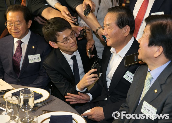(서울=포커스뉴스) 19일 오후 여의도 서울시티클럽에서 열린 충청 향우 친선의 밤 행사에 참석한 서청원 새누리당 전 최고위원이 취재진 질문에 답하고 있다. 오른쪽부터 박병석 더불어민주당 의원, 서 의원, 이종배 새누리당 의원.