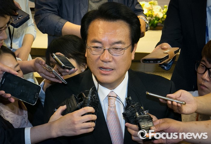 (서울=포커스뉴스) 19일 오후 여의도 서울시티클럽에서 열린 충청 향우 친선의 밤 행사에 참석한 정진석 새누리당 원내대표가 취재진 질문에 답하고 있다.