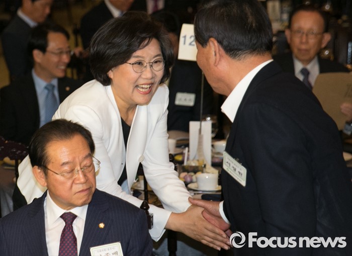 (서울=포커스뉴스) 19일 오후 여의도 서울시티클럽에서 열린 충청 향우 친선의 밤 행사에 참석한 서청원(오른쪽) 새누리당 전 최고위원과 이혜훈 비대위원이 인사하고 있다.
