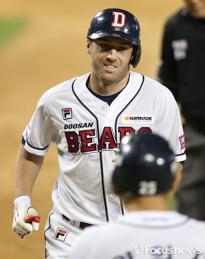 (서울=포커스뉴스) 19일 서울 잠실구장에서 열린 2016프로야구 KIA-두산 경기 5회말 2사 1루에서 두산 에반스가 좌월 2점 홈런을 치고 선행주자 양의지의 환영을 받으며 홈인하고 있다.