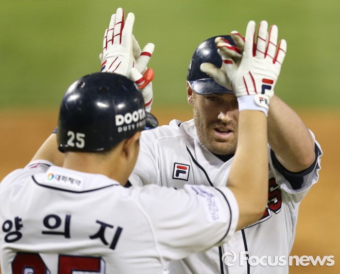 (서울=포커스뉴스) 19일 서울 잠실구장에서 열린 2016프로야구 KIA-두산 경기 5회말 2사 1루에서 두산 에반스가 좌월 2점 홈런을 치고 선행주자 양의지의 환영을 받으며 홈인하고 있다.